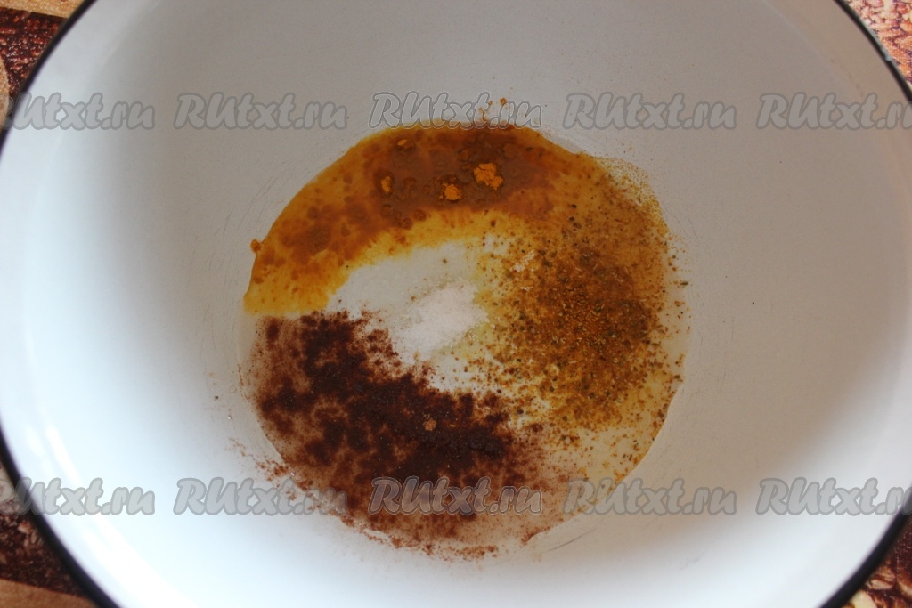Для приготовления обмазки для куриных крылышек нужно соединить растительное масло, карри, куркуму, корицу и соль.