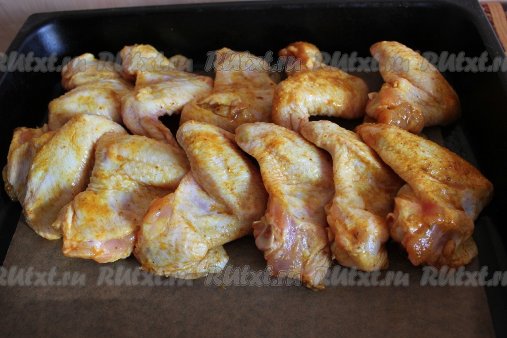 Куриные крылышки равномерно обмазать специями и оставить 30 минут или подольше.