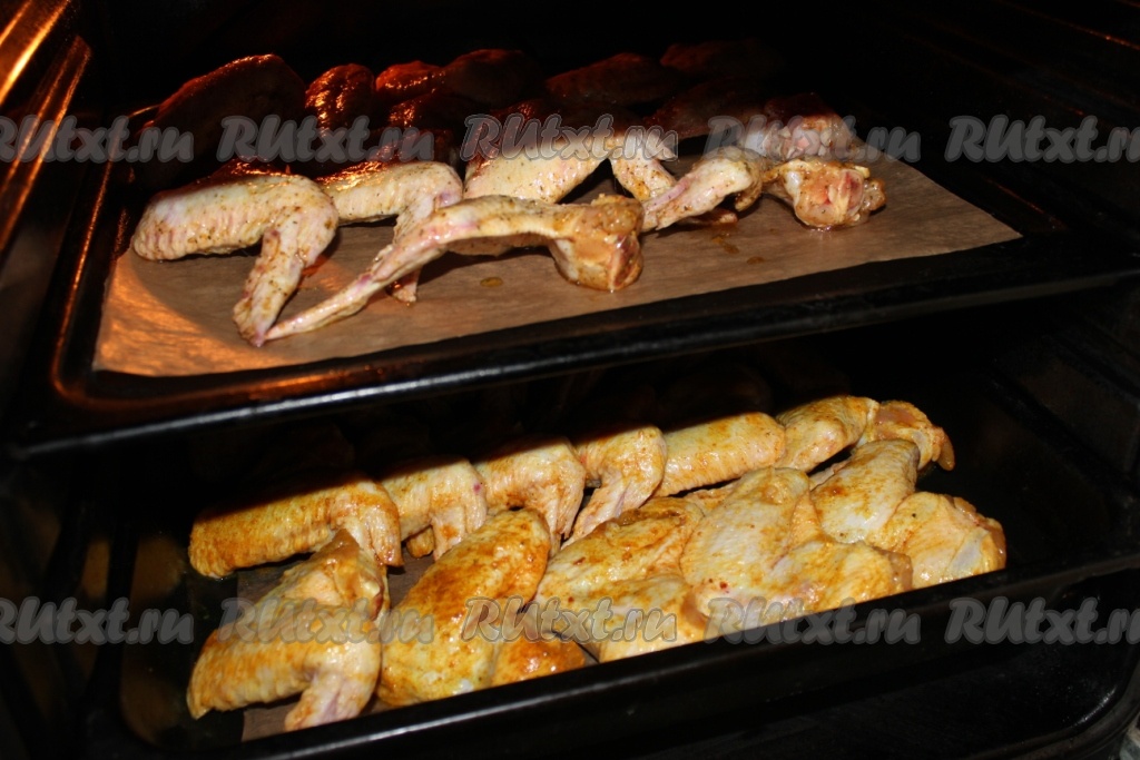 Поместить куриные крылышки в разогретую духовку и запекать при 200 градусах около 45 минут, в самом конце минут на 5 можно включить режим "гриль".