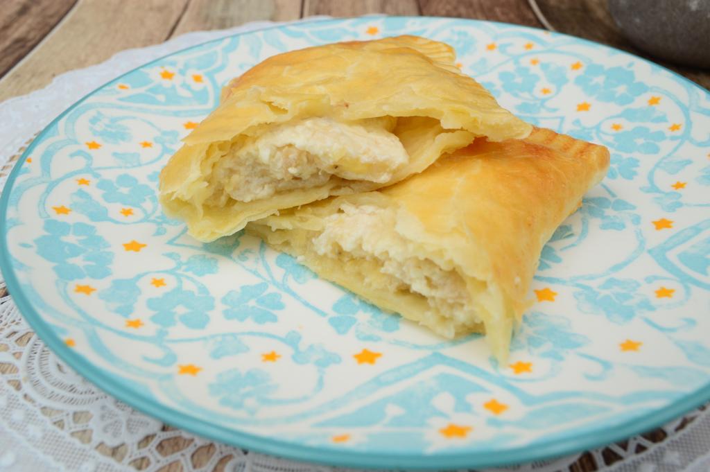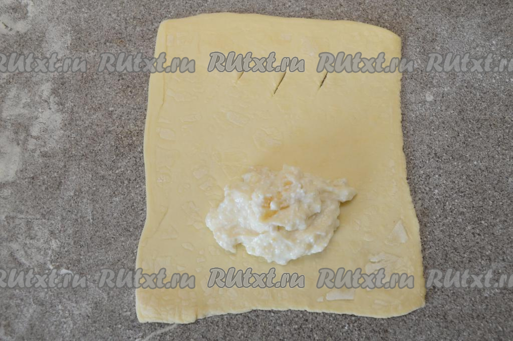 Визуально квадрат разделить на 2 половинки. На одну половину квадрата выложить столовую ложку начинки из творога и банана. На другой половинке сделать 3 небольших разреза (эти разрезы нужны для выхода пара при выпечке).