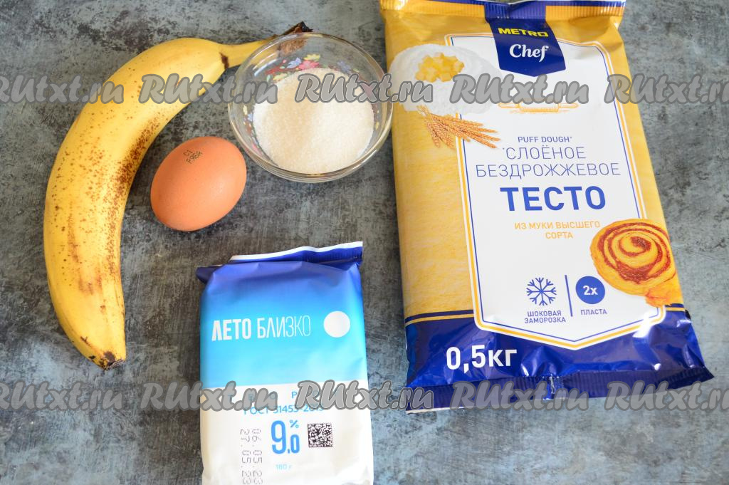 Подготовить продукты. Слоёное тесто можно взять дрожжевое или бездрожжевое - в данном рецепте это не имеет значения. Тесто следует заранее достать из морозилки, чтобы оно разморозилось при комнатной температуре. Банан лучше всего брать сладкий, спелый.