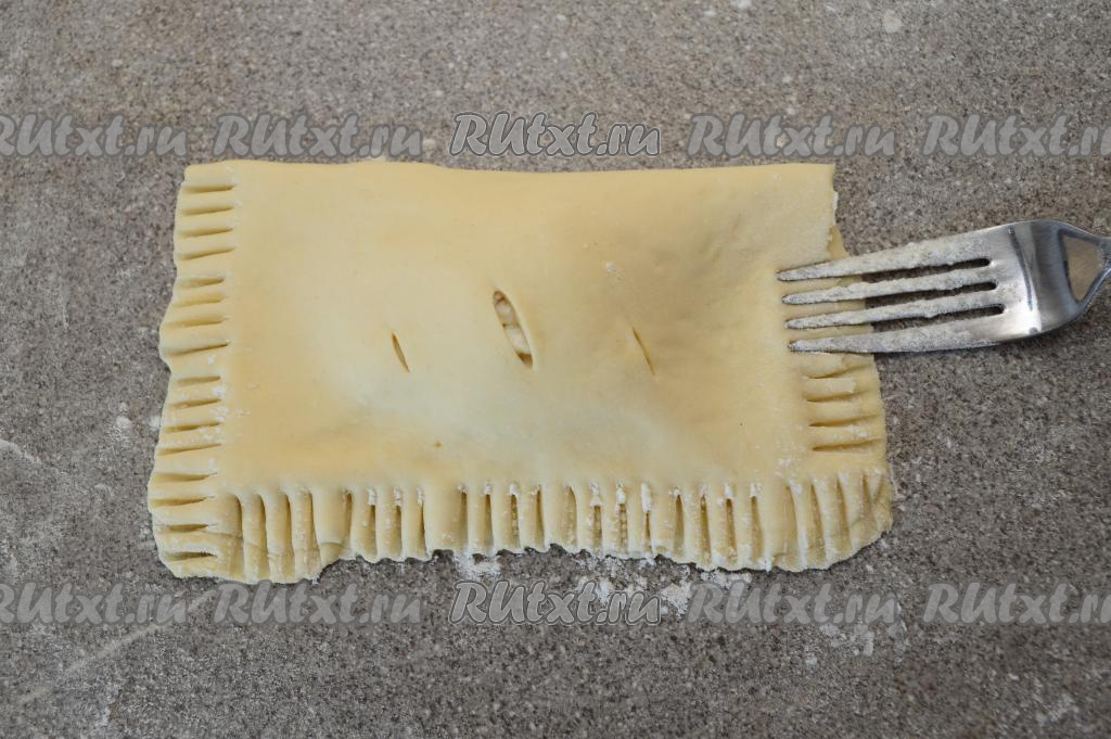 Используя вилку, тщательно скрепить края слойки. Вилку лучше периодически окунать в муку, чтобы она не прилипала к тесту. Аналогично сформировать заготовки слоек с творогом и бананом из оставшихся 7 прямоугольников. Всего должно получиться 8 заготовок слоек.