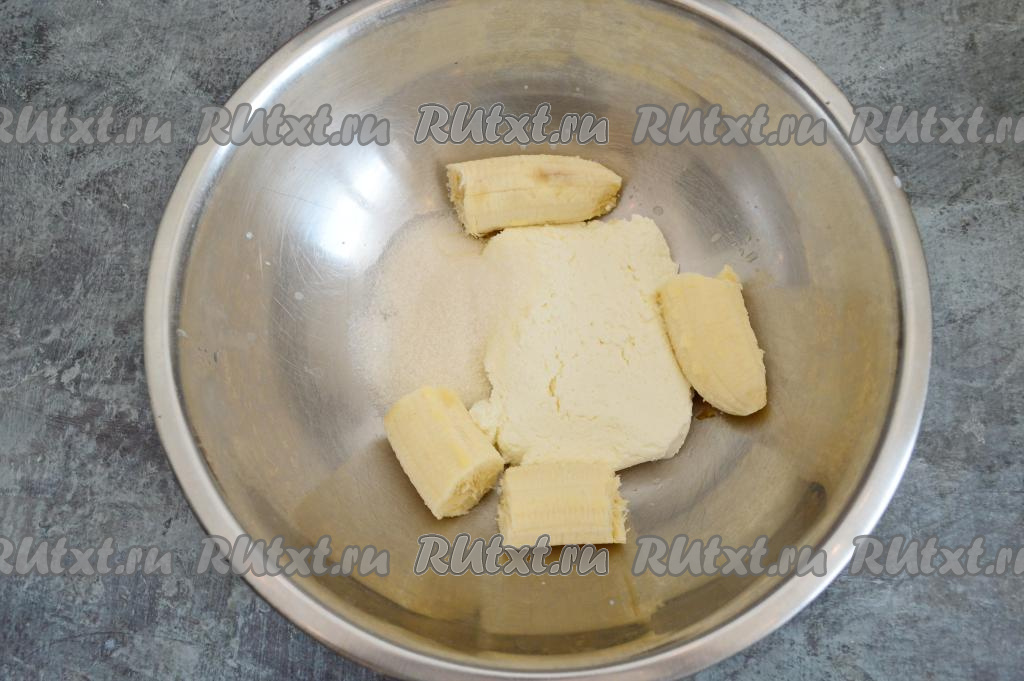 В глубокой миске соединить творог, сахар и очищенный банан, поломанный на кусочки.