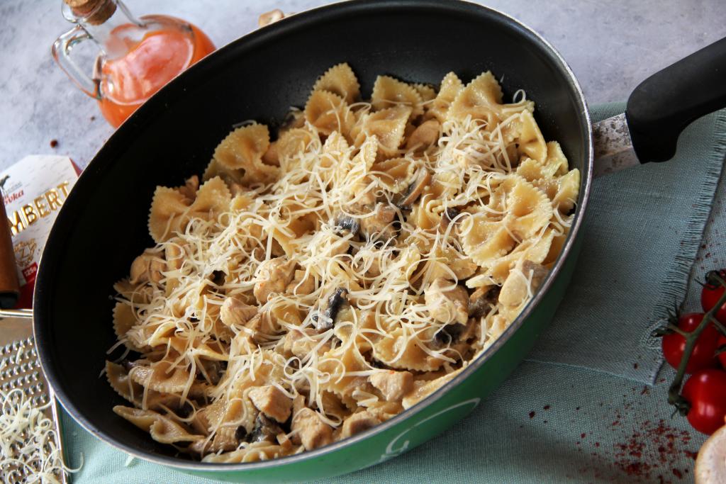 Макароны откинуть на дуршлаг и, не промывая, добавить в сковороду с курицей и шампиньонами в сливочном соусе.