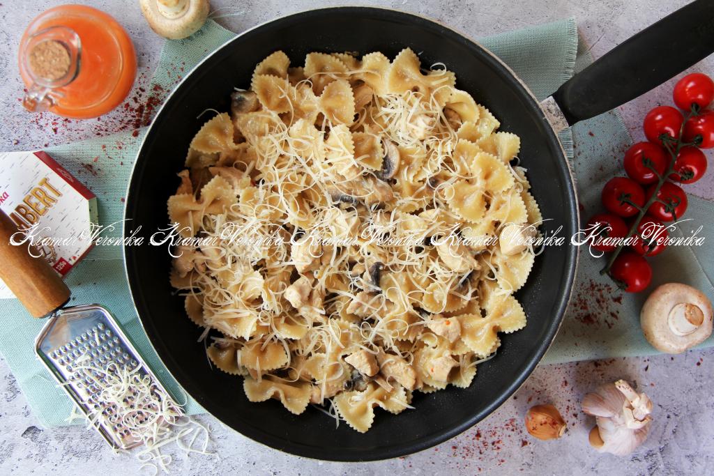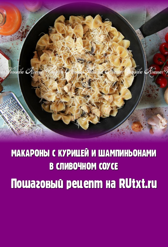 Перемешать макароны с курицей, сливочным соусом и шампиньонами, потомить 2-3 минуты на медленном огне. По желанию присыпать сверху натёртым сыром. Вкусное, нежное, ароматное блюдо сразу подать к столу.