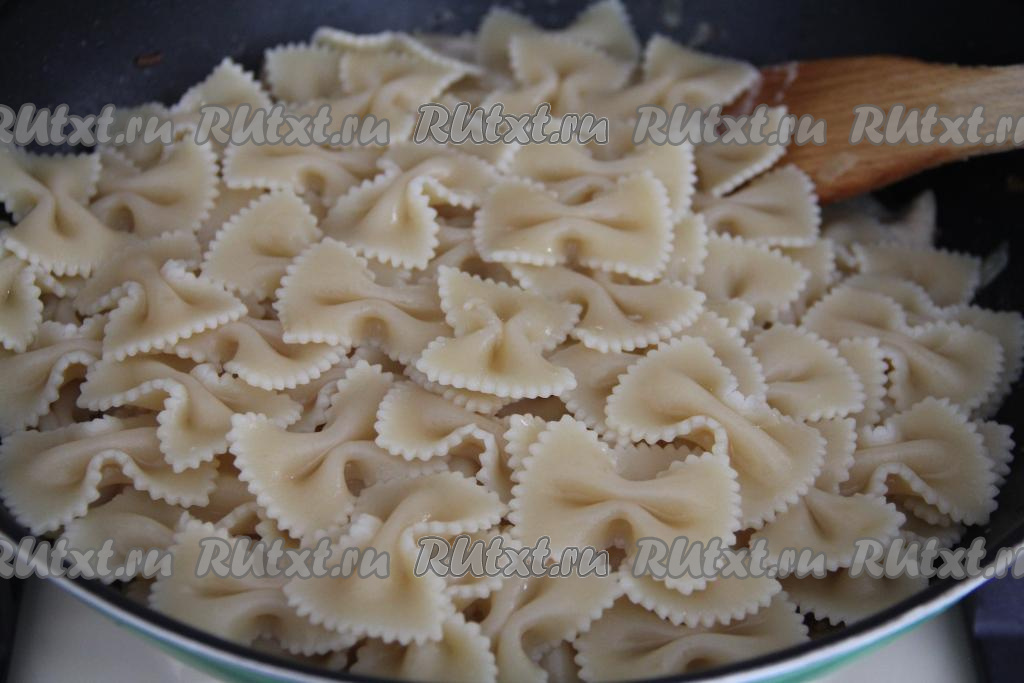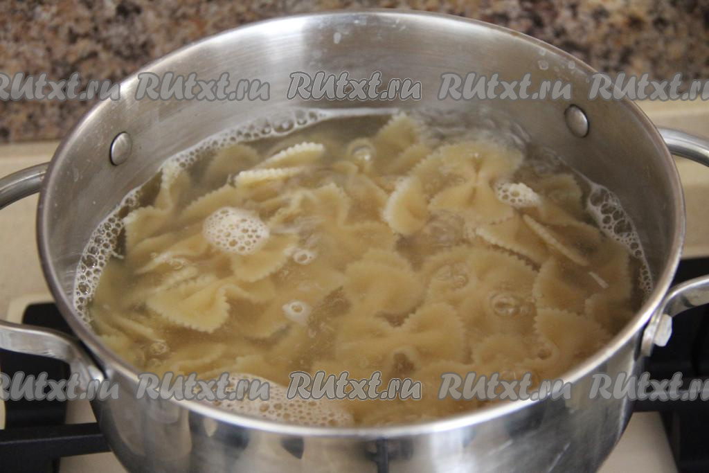 Одновременно с началом обжаривания куриного мяса нужно в кастрюлю, в которой вы будете готовить макароны, влить воду, поставить на огонь. Подсолить закипевшую воду, всыпать макароны, снова дать закипеть и варить до готовности на небольшом огне в течение времени, указанного на упаковке макаронных изделий, которые вы варите (я отваривала 12 минут).