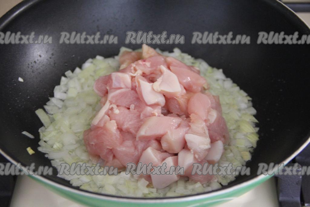 Затем добавить куриное филе, нарезанное на кубики размером 2 сантиметра на 2 сантиметра, перемешать.
