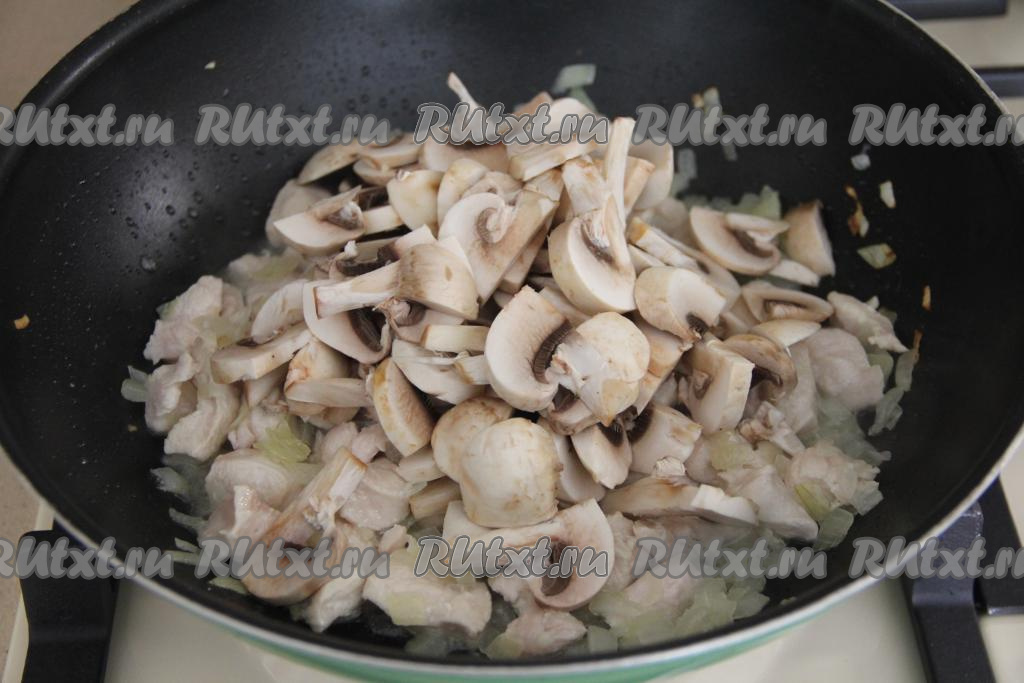 Обжарить куриное мясо с луком в течение 5 минут, периодически перемешивая. Затем добавить нарезанные шампиньоны, перемешать и жарить грибы до готовности (минут 15), не забывая иногда перемешивать.