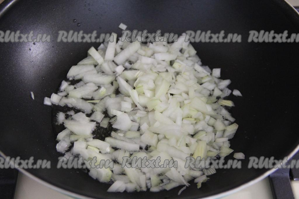В сковороде хорошо прогреть растительное масло, а затем выложить мелко нарезанный лук и обжарить его до прозрачности (в течение 4-5 минут), время от времени помешивая, на среднем огне.
