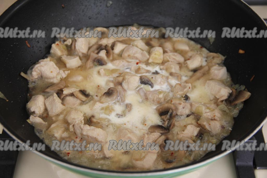 Добавить в сковороду к готовой курице и грибам соль, специи по вкусу, влить сливки, перемешать. Довести сливки до кипения и потомить 2-3 минуты на медленном огне, иногда помешивая.