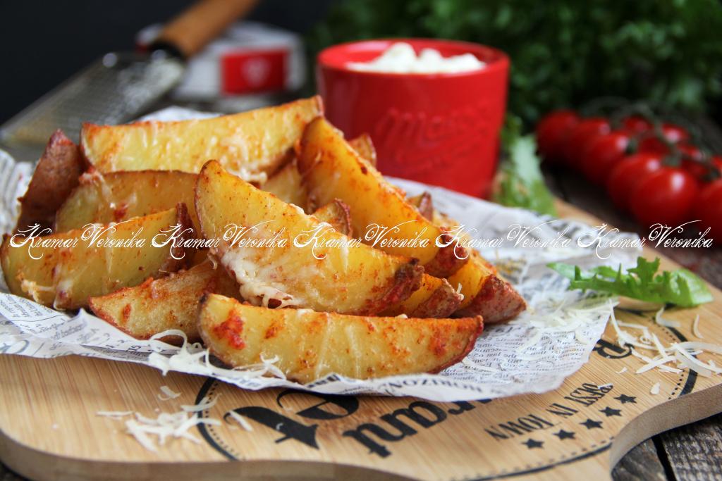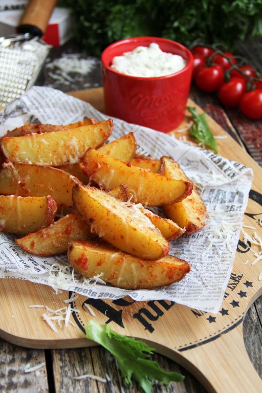 Аппетитную картошку по-деревенски, приготовленную с паприкой и чесноком, достать из духовки, переложить на тарелку и в горячем виде подать к столу, дополнив соусом.