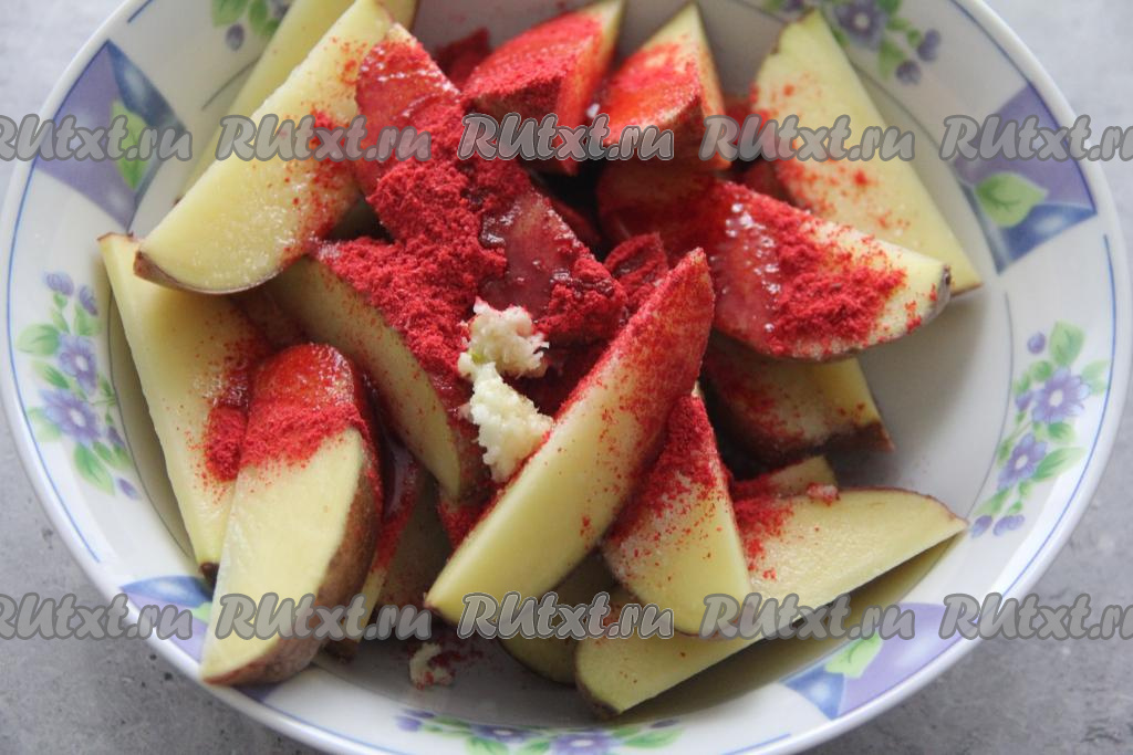 Картошку нарезать на крупные дольки, переложить в объёмную миску, добавить соль, паприку, пропущенный через пресс зубчик чеснока, влить масло.