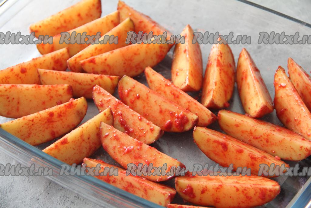 Картофельные дольки выложить в один слой в жаропрочную форму (или на противень).