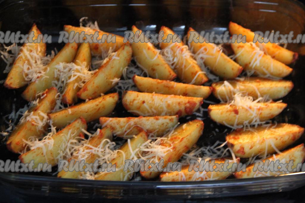 Запекать картошку по-деревенски в разогретой духовке без конвекции при температуре 180 градусов минут 40. Готовность проверить, проколов картофельную дольку зубочисткой (зубочистка в готовый картофель будет входить без усилий). Готовую картошку, по желанию, присыпать натёртым сыром и поставить на 2-3 минуты в горячую духовку.