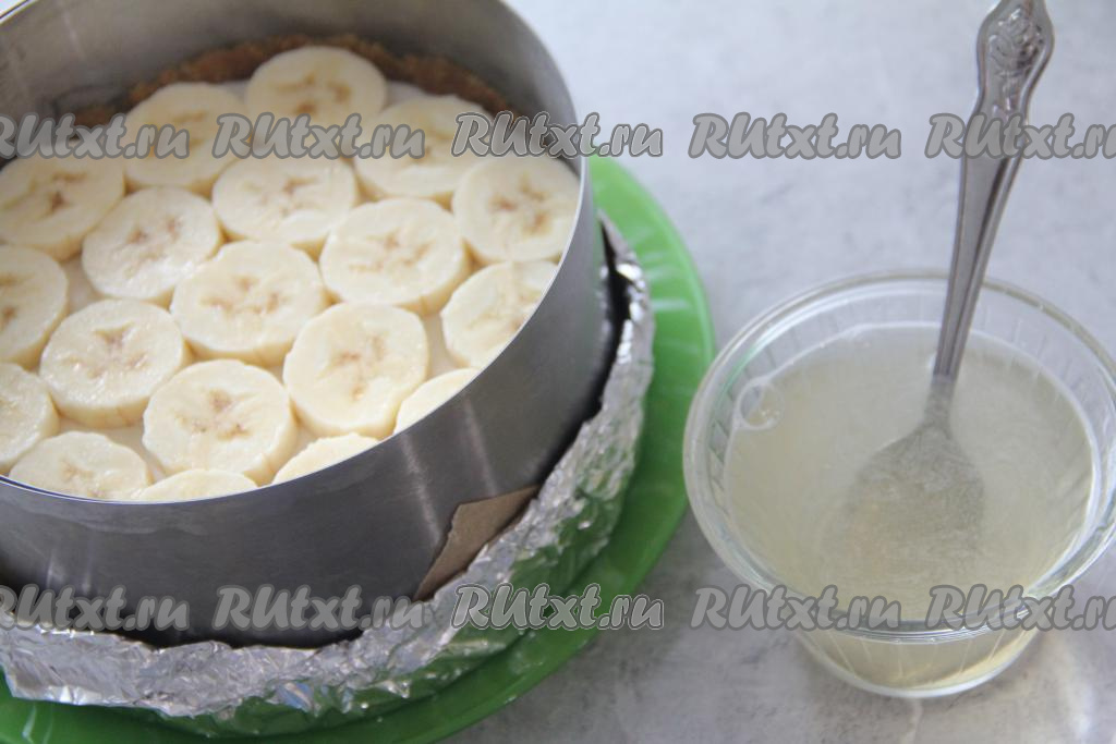 Аккуратно влить получившуюся желатиновую заливку поверх бананов так, чтобы заливка покрыла бананы полностью. Убрать чизкейк, приготовленный с бананом, творогом и желатином, в холодильник на ночь (до полного застывания).