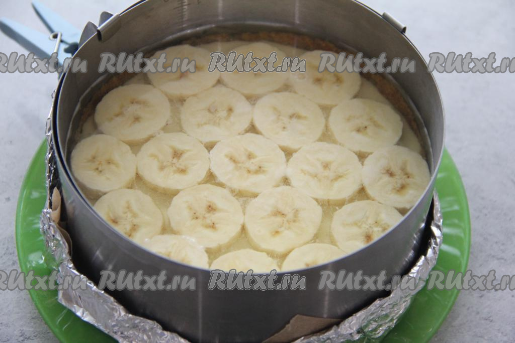 Творожно-банановую массу влить в форму с основой чизкейка из печенья и поставить в холодильник на 2 часа (до застывания начинки).