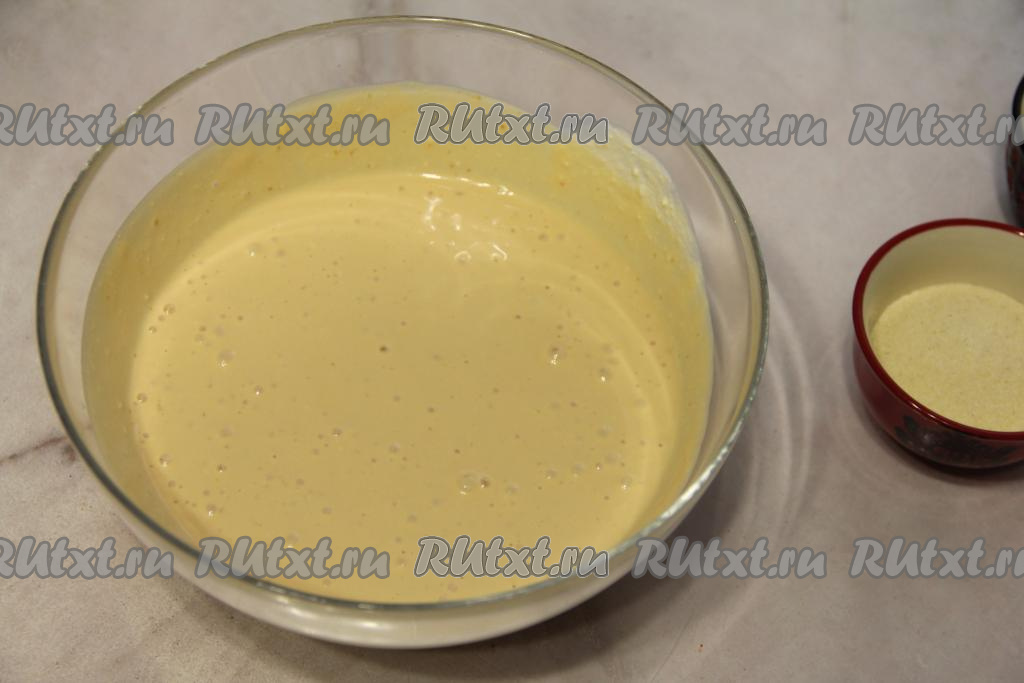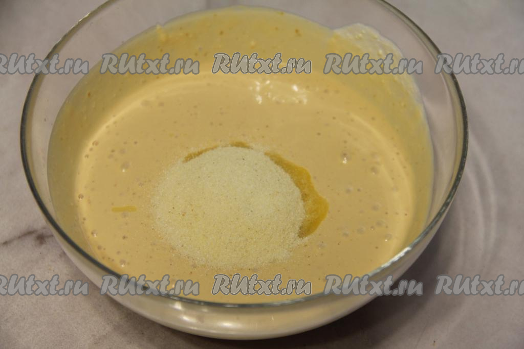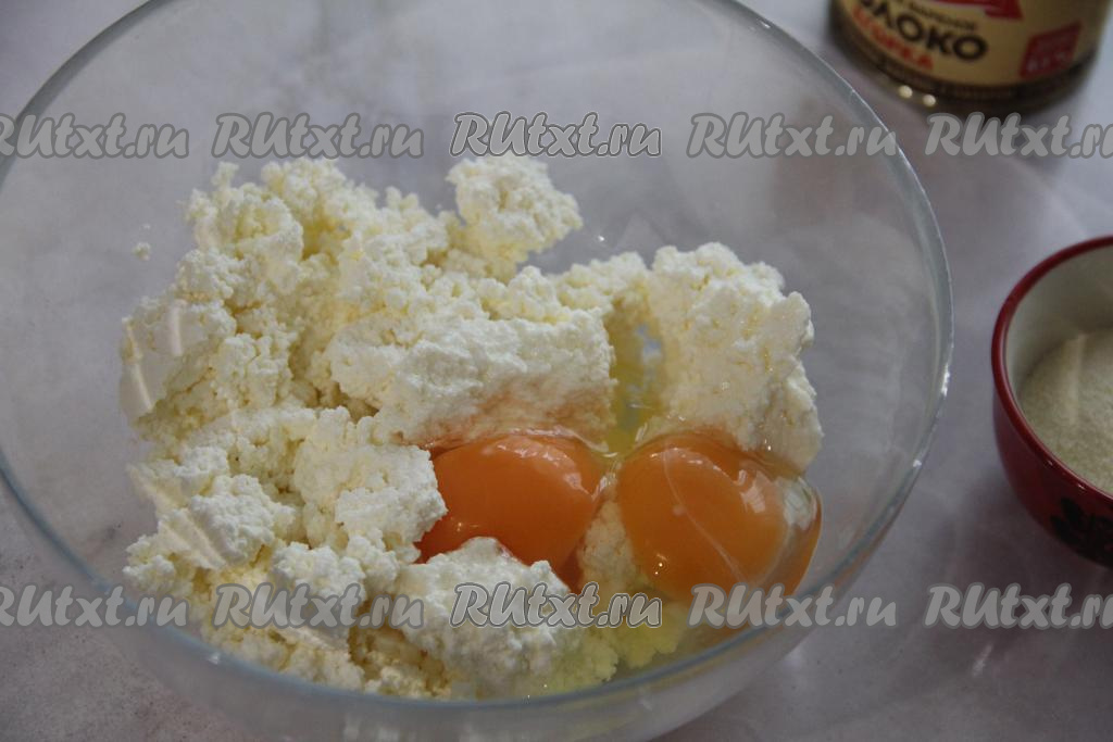 Сливочное масло растопить, дать немного остыть и влить в получившуюся массу из творога и сгущёнки, сюда же всыпать манку, перемешать творожную массу столовой ложкой.