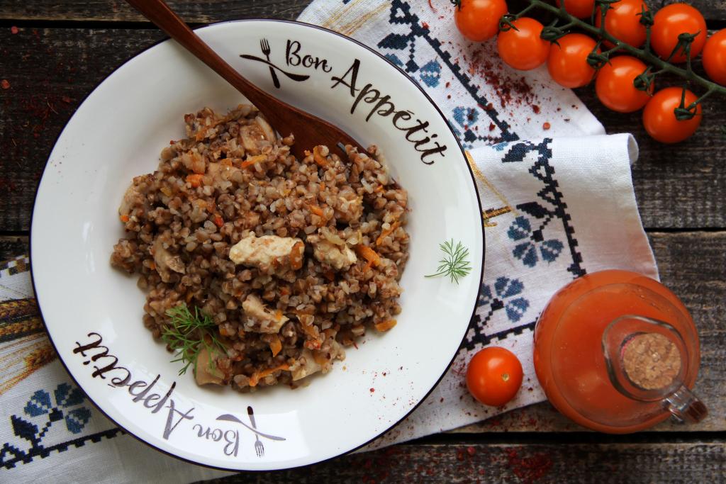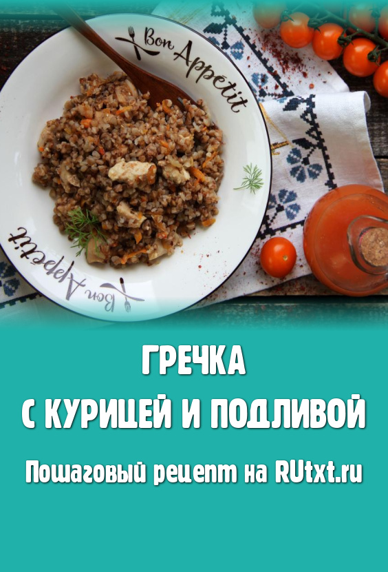 Затем гречку, приготовленную с курицей и подливой, перемешать и сразу подать к столу.