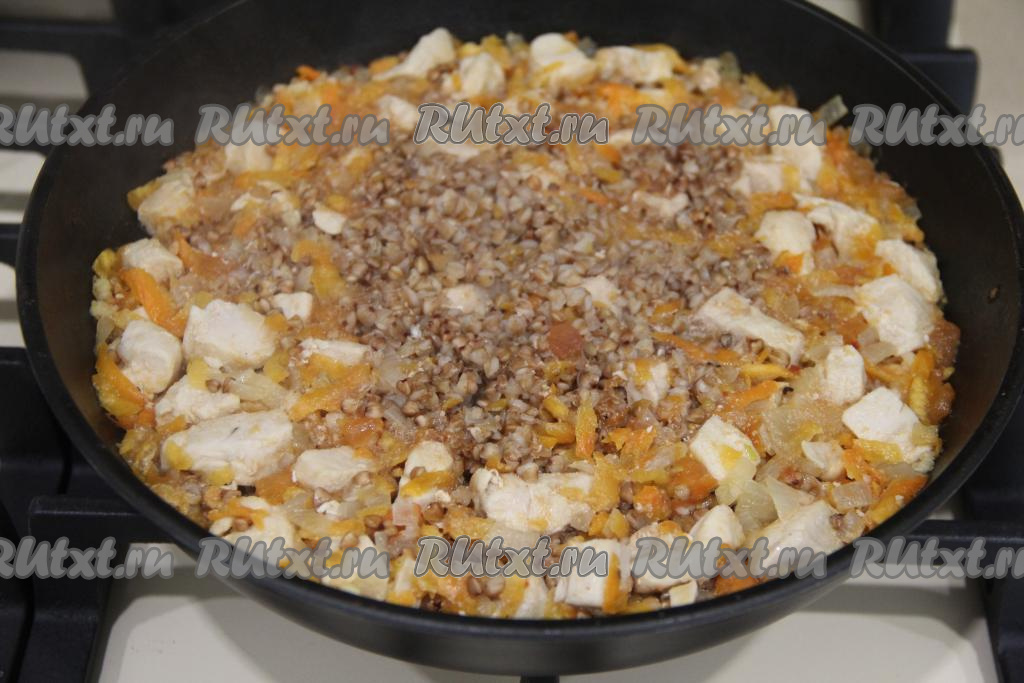 Гречку промыть водой, если есть чёрные зёрнышки, их нужно удалить, дать стечь лишней воде с крупы. Выложить крупу в сковороду с курицей и подливой, перемешать, довести до кипения, убавить огонь до минимума.
