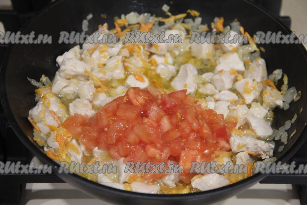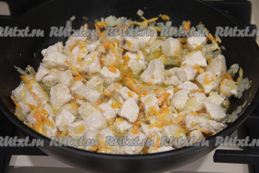 Вымытое куриное филе нарезать на небольшие кубики (я нарезала на кубики размером 1,5х1,5 сантиметра), добавить в сковороду с обжаренными овощами, перемешать.