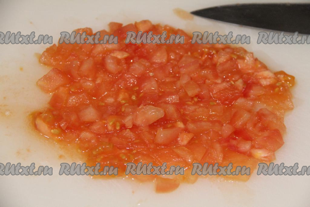 Вымытый помидор обдать кипятком, снять шкурку, а затем нарезать мелко.
