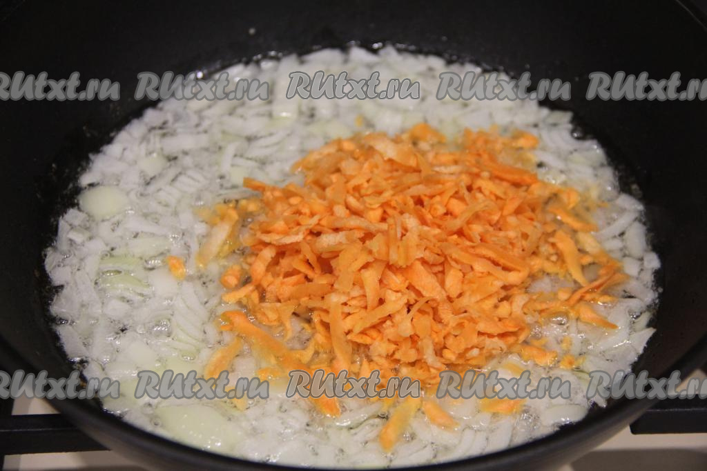 К луку, обжаренному до прозрачности, выложить натёртую на крупной тёрке морковку, перемешать. Обжаривать овощи приблизительно 4-5 минут (до мягкости морковки), периодически помешивать.