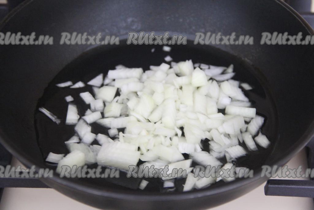 Морковку и лук очистить. В сковороде хорошо прогреть растительное масло и выложить достаточно мелко нарезанную луковицу, обжаривать её до прозрачности (3-4 минуты), иногда помешивая, на среднем огне.