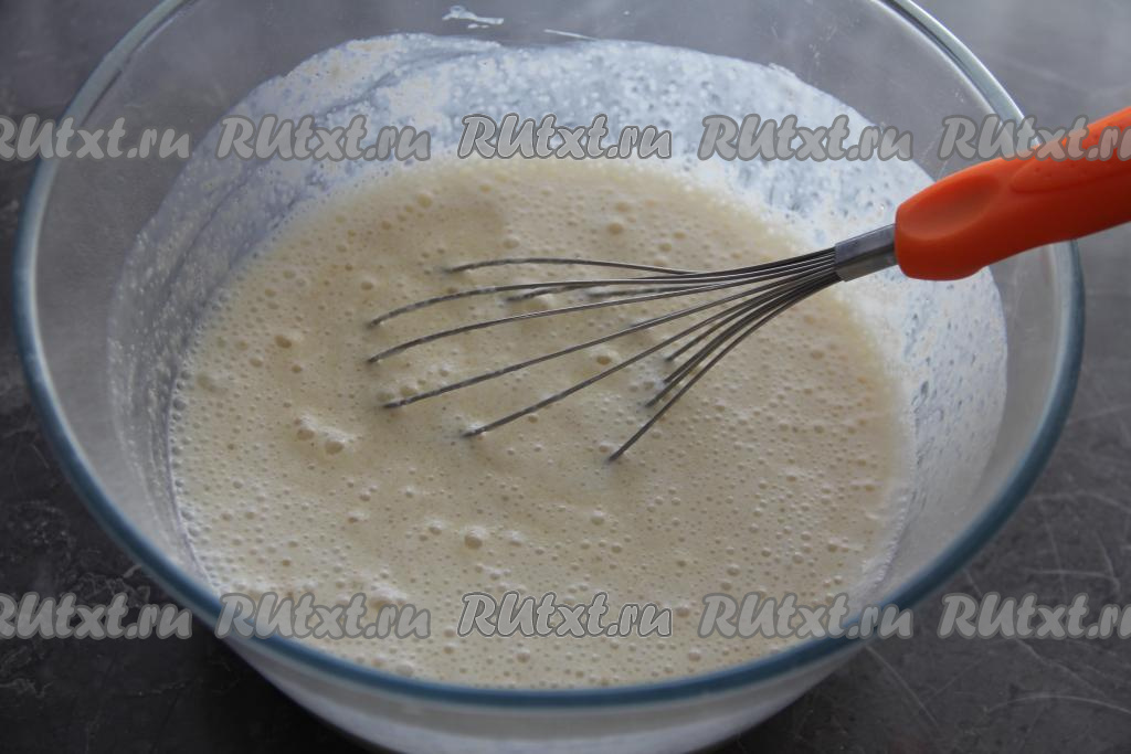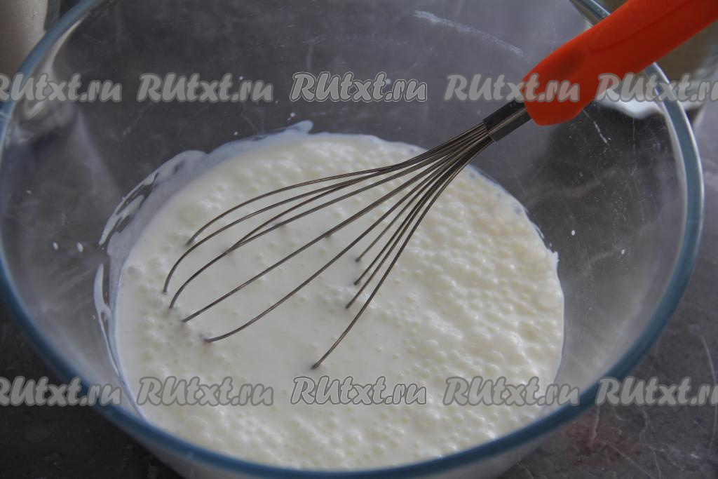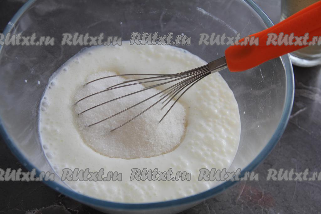 В запенившуюся смесь кефира и соды всыпать сахар, перемешать венчиком.