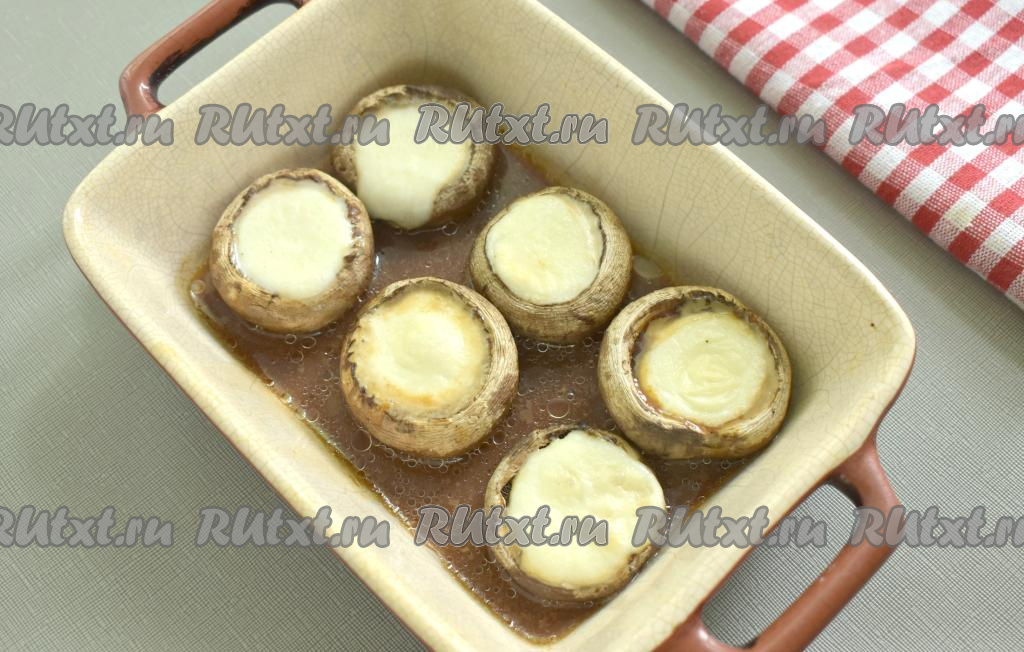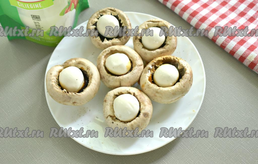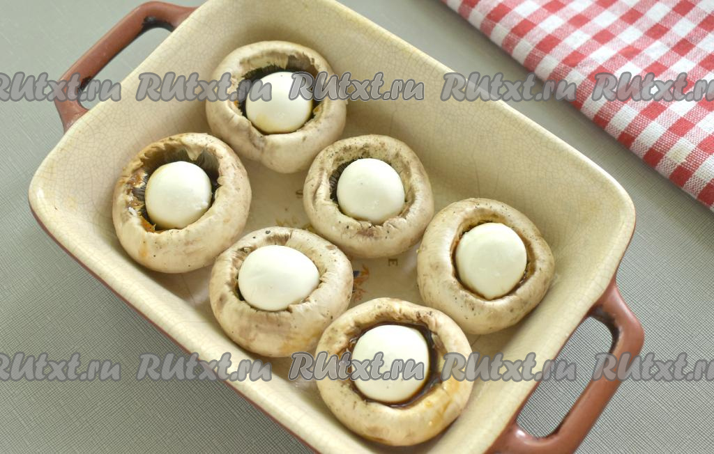 Затем помещаем в каждую шляпку по шарику моцареллы.