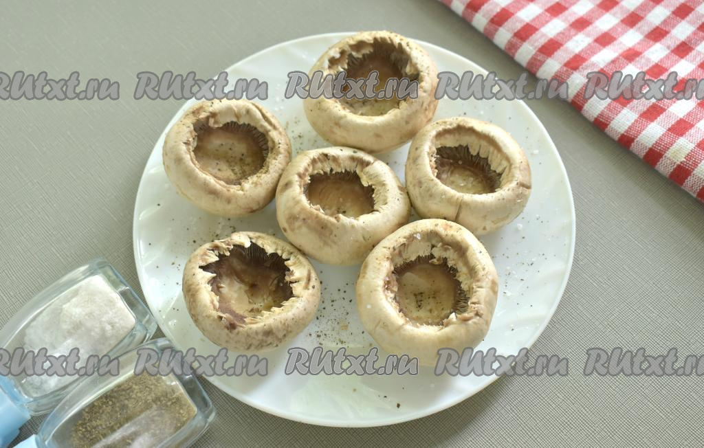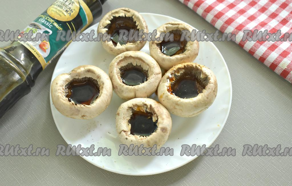Шляпки шампиньонов перчим внутри и слегка присаливаем (соли используем чуть-чуть, ведь у нас в рецепте будет присутствовать соевый соус, который и так достаточно солёный).