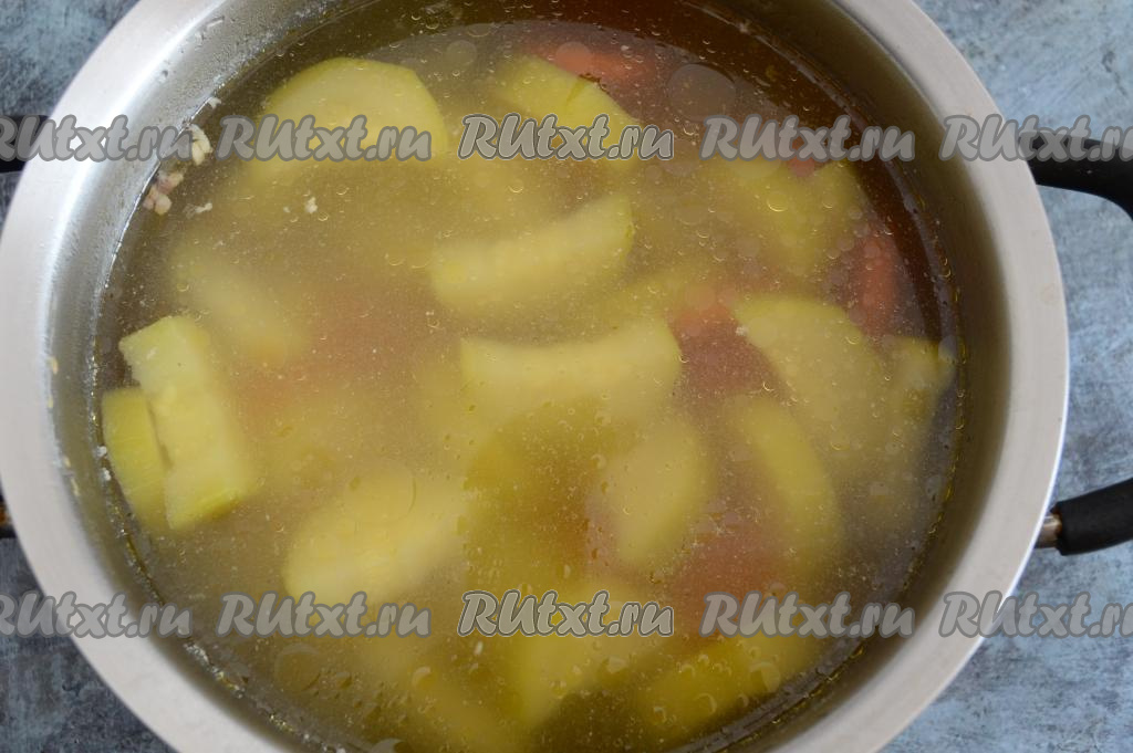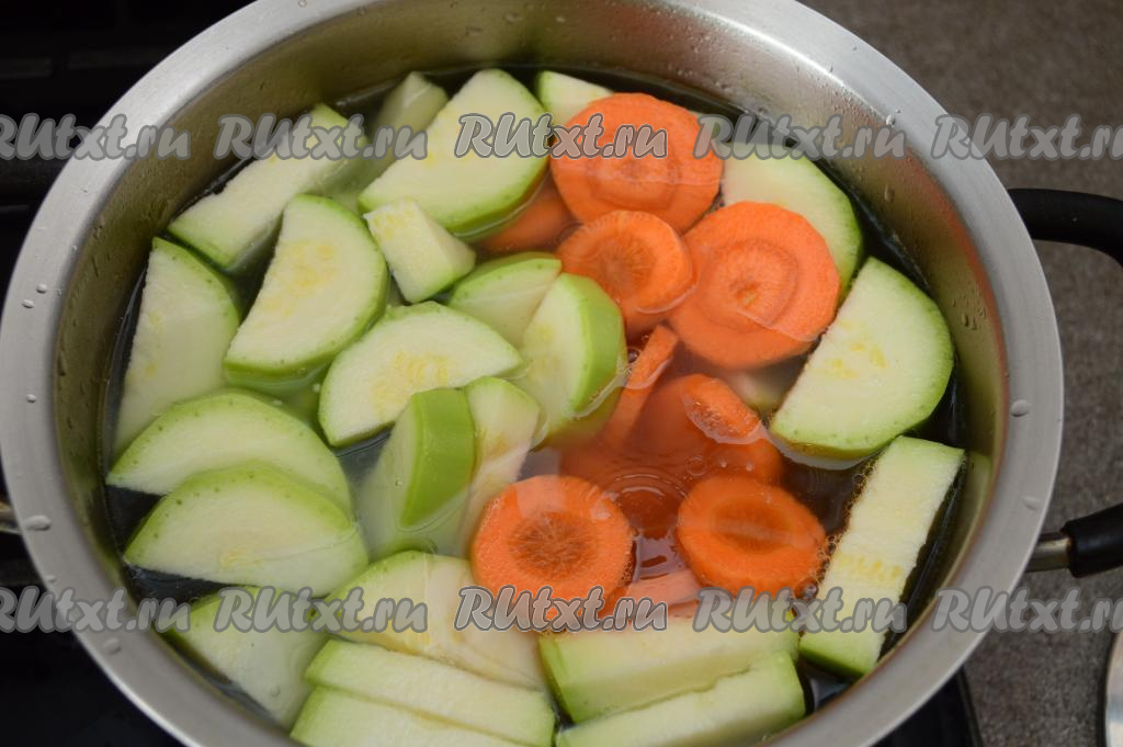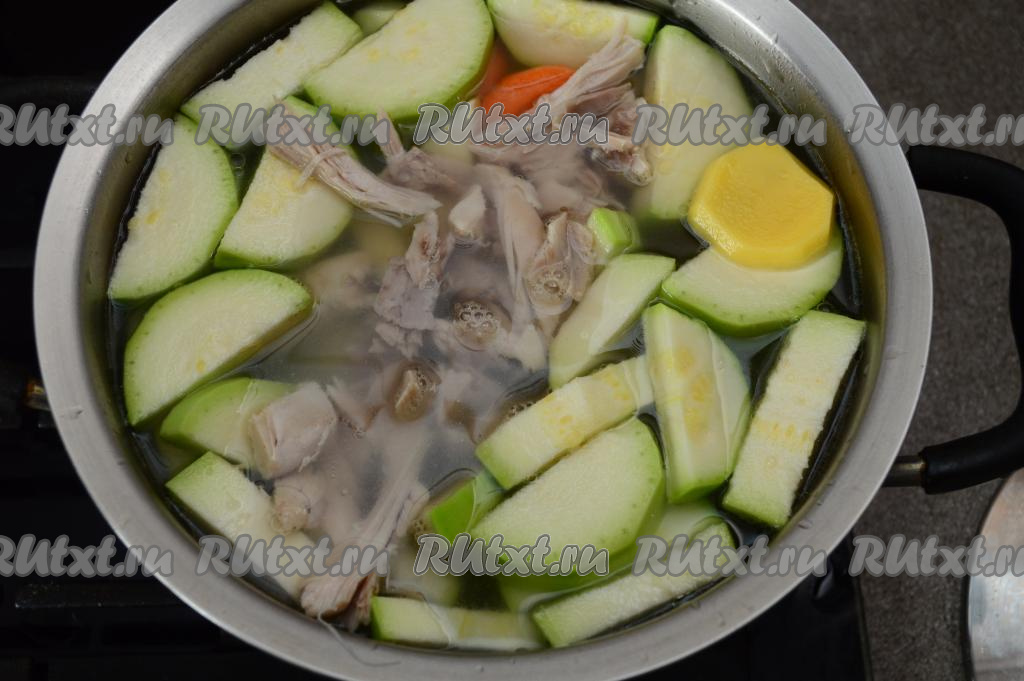 Выложить кабачок и морковь в бульон.