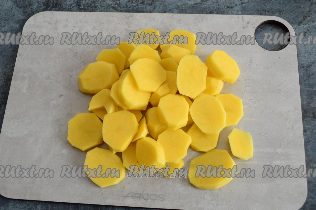 Картофель очистить и нарезать на кружочки средней толщины (или брусочки).