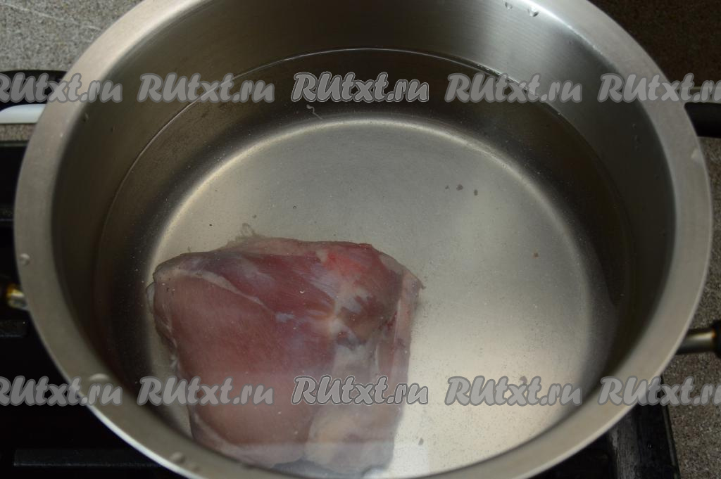 Первым делом следует сварить куриный бульон. Для этого в кастрюлю нужно выложить вымытые части курицы (я взяла одно куриное бедро без кожи), влить два литра воды, поставить на огонь. Когда бульон закипит, снять пенку и варить куриное мясо на медленном огне под крышкой минут 25-30. Затем мясо достать из бульона и оставить остывать. Бульон, при необходимости, процедить, затем вернуть в кастрюлю и довести на огне до кипения.