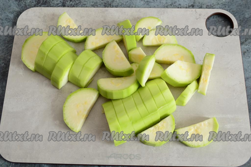 Очистить кабачок от кожуры и нарезать их достаточно крупно.