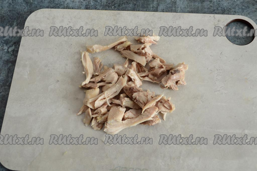 Остывшее мясо отделить от костей. Если кусочки мяса после отделения от костей очень большие, разрежьте их на несколько частей (после варки суп будет пюрироваться, но если кусочки мяса будут очень крупными, они могут не до конца пюрироваться и будут ощущаться в готовом блюде).