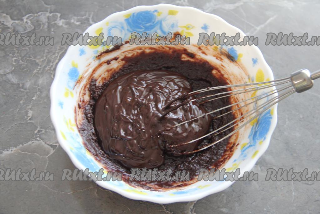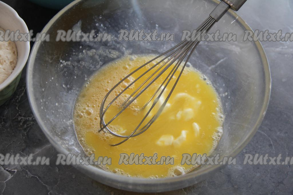 Сливочное масло растопить (это можно сделать в микроволновке или на плите), дать ему немного остыть и влить в яичную смесь, перемешать.
