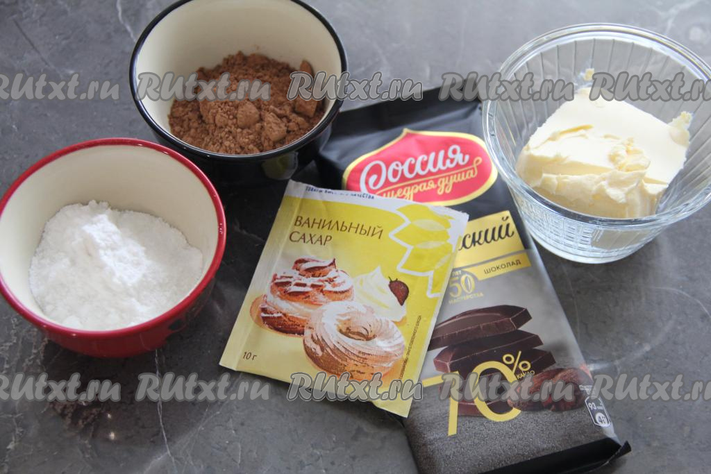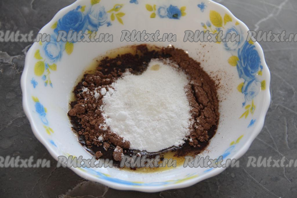 Для приготовления начинки нужно сливочное масло растопить до жидкого состояния, дать ему немного остыть. В растопленное масло всыпать какао, сахарную пудру и ванильный сахар, перемешать венчиком.