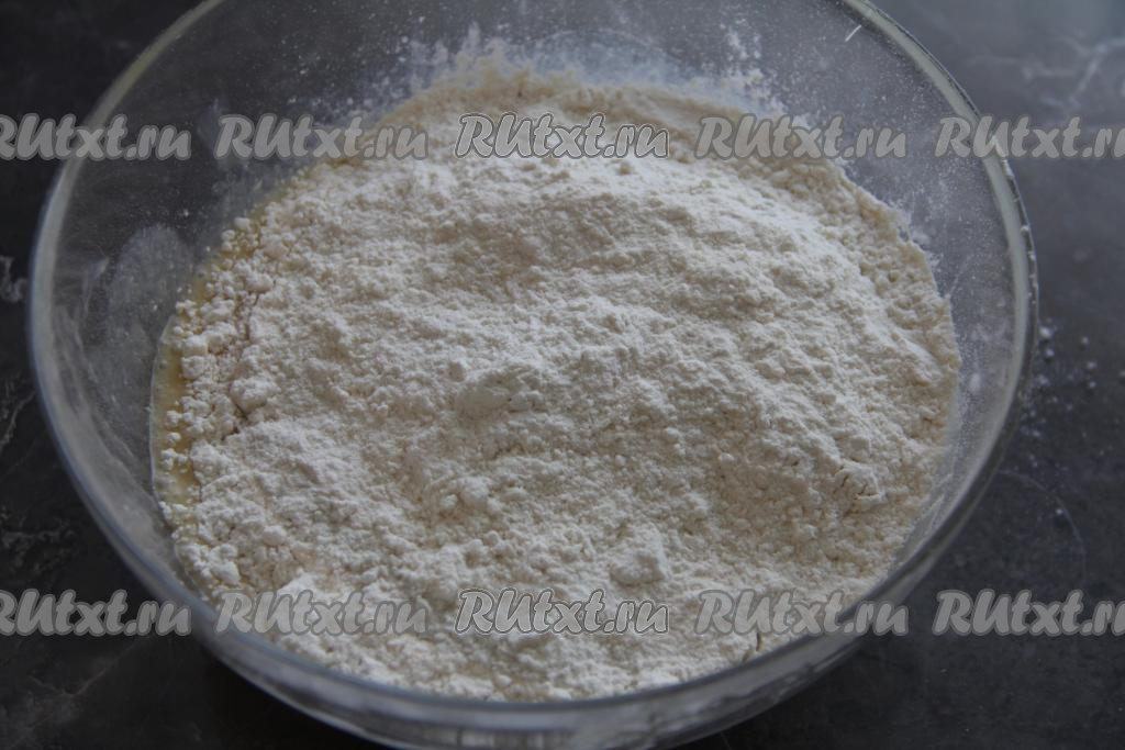 Частями всыпать просеянную муку, каждый раз очень хорошо вмешивая её в дрожжевое тесто. Вначале, добавляя муку, нужно перемешивать тесто ложкой, а затем, подсыпая муку только по мере необходимости, вымесить тесто руками в течение 7-8 минут.