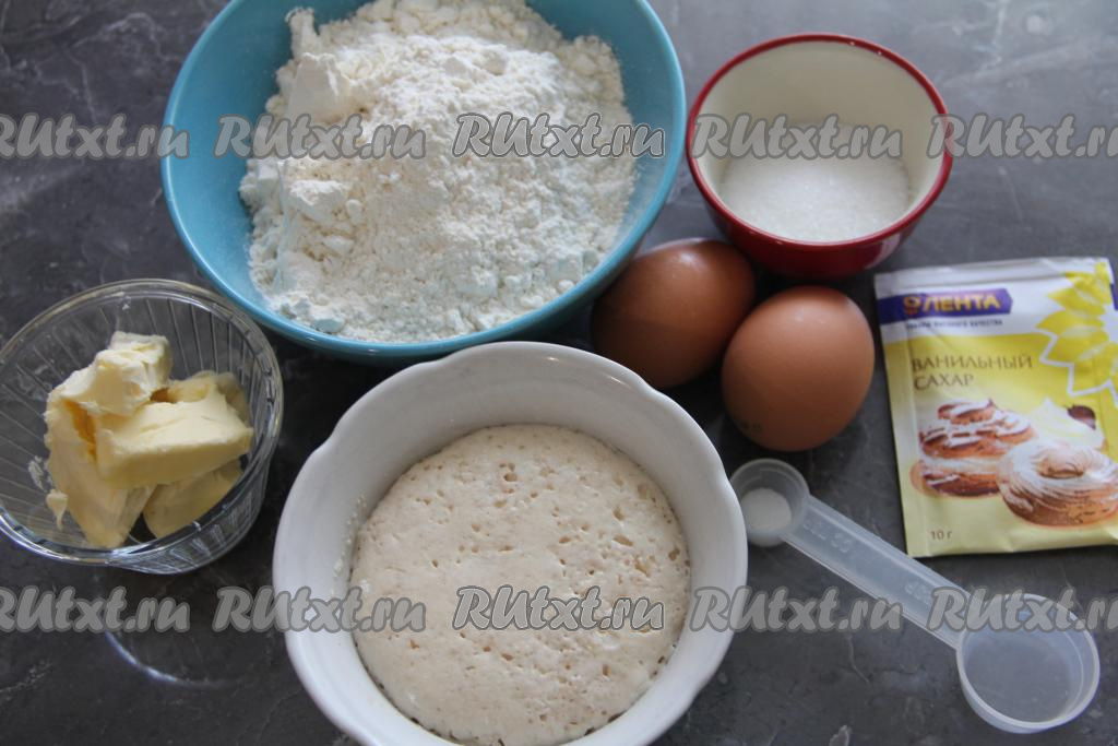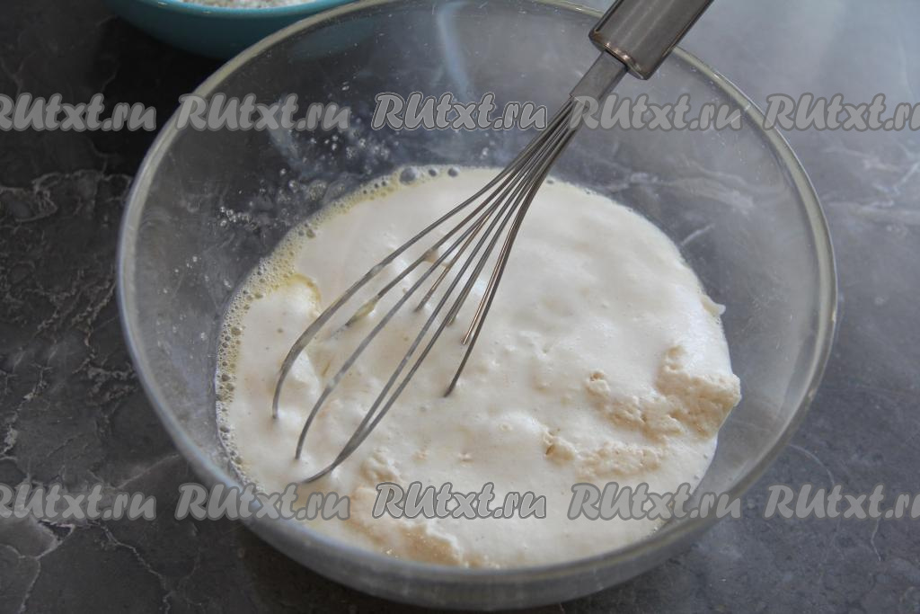 Первым делом следует сделать опару, для этого в тёплое молоко (температура молока должна быть 38-40 градусов) нужно всыпать дрожжи, 1 чайную ложку сахара и 1 столовую ложку муки (муку и сахар берём из того количества, которое указано в ингредиентах), хорошо перемешать опару и оставить в тёплом месте на 20 минут. Опара за это время запузырится и покроется пышной шапкой.