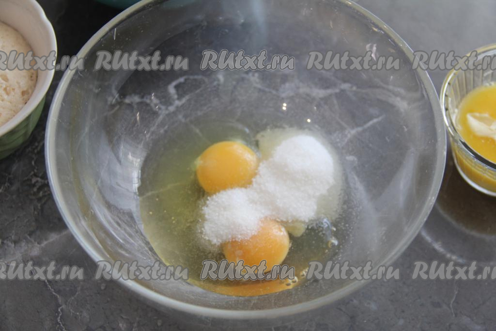 В достаточно глубокой миске соединить яйца, соль, ванильный сахар, оставшийся сахар, перемешать яичную смесь венчиком.