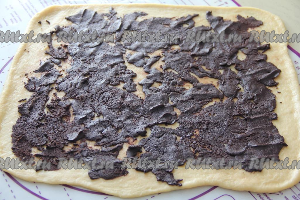 Тесто обмять, а затем на слегка присыпанной мукой поверхности раскатать в пласт толщиной 0,5 сантиметра, смазать его шоколадной начинкой, отступив от краёв примерно 1-2 сантиметра.