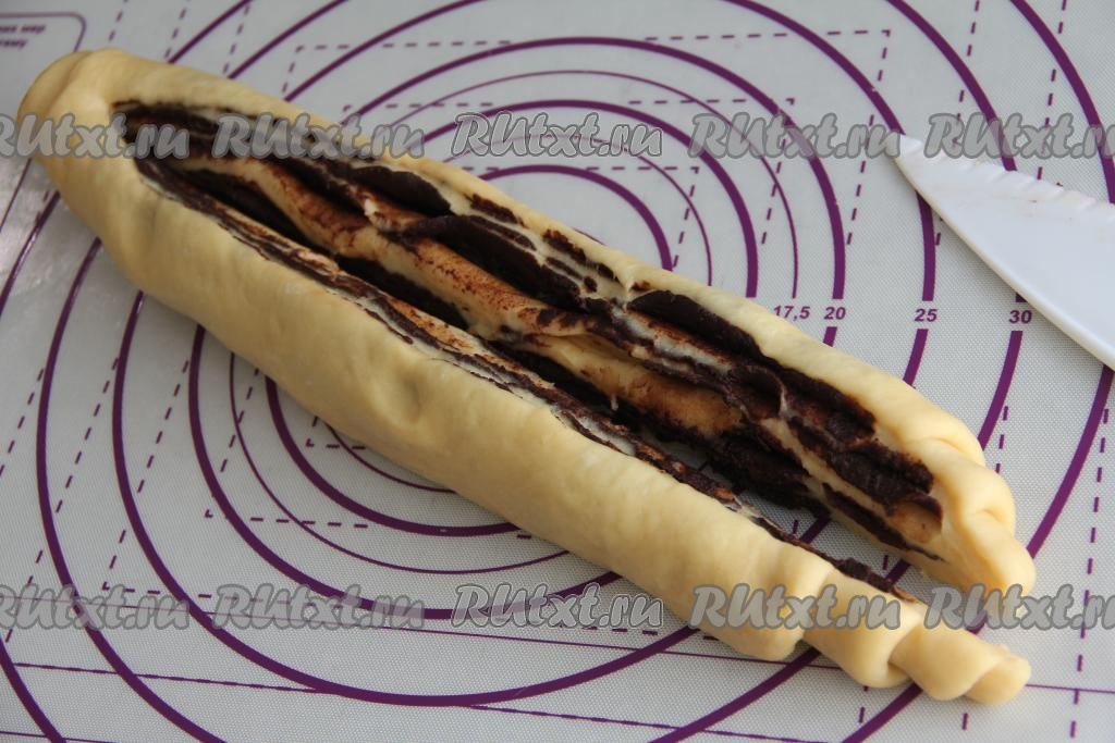 Свернуть тесто с шоколадной начинкой в плотный рулет, начиная с широкого края.