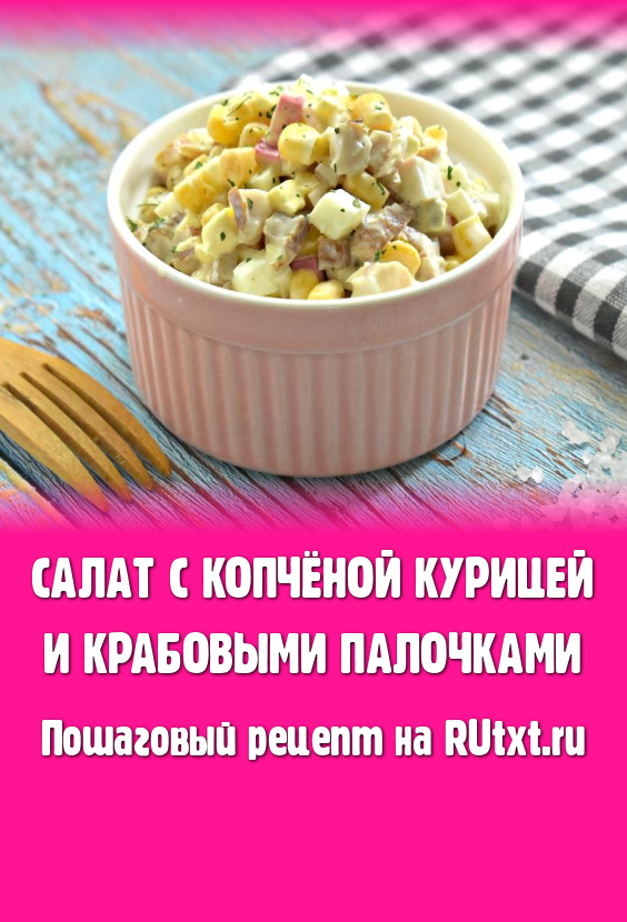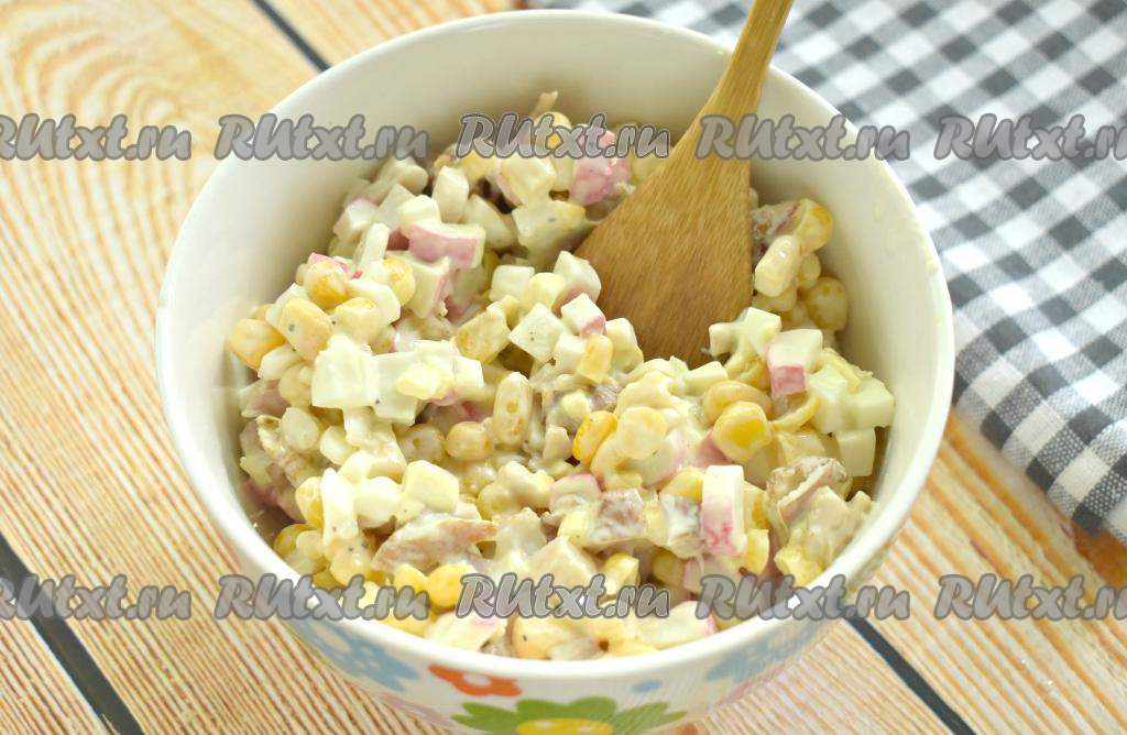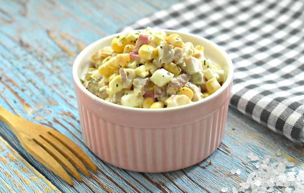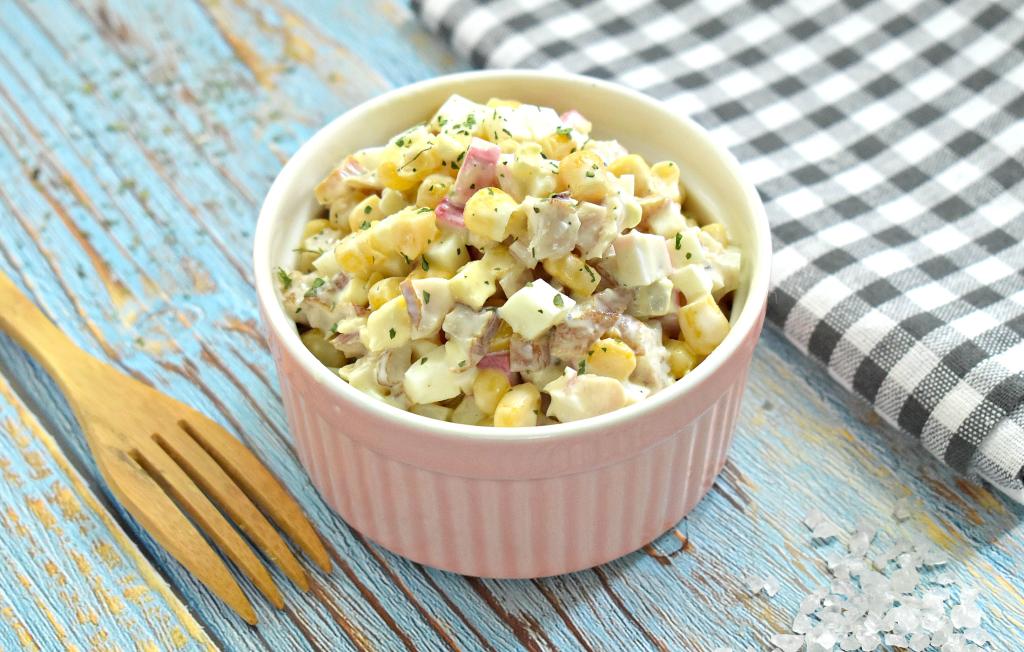 Вкусный, сытный, аппетитный салат, приготовленный с варёными яйцами, копчёной курицей, консервированной кукурузой и крабовыми палочками, разнообразит меню и в будни, и в праздники.