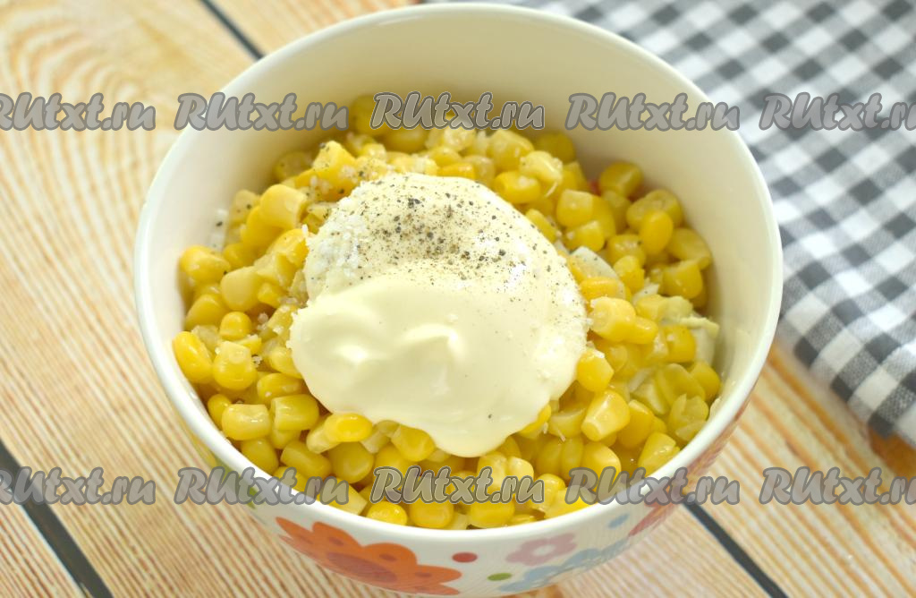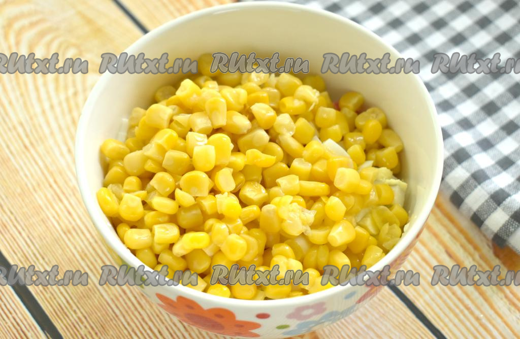 Откидываем консервированную кукурузу на сито, чтобы слить жидкость. Затем зёрна кукурузы добавляем в салат из копчёной курицы, яиц и крабовых палочек.