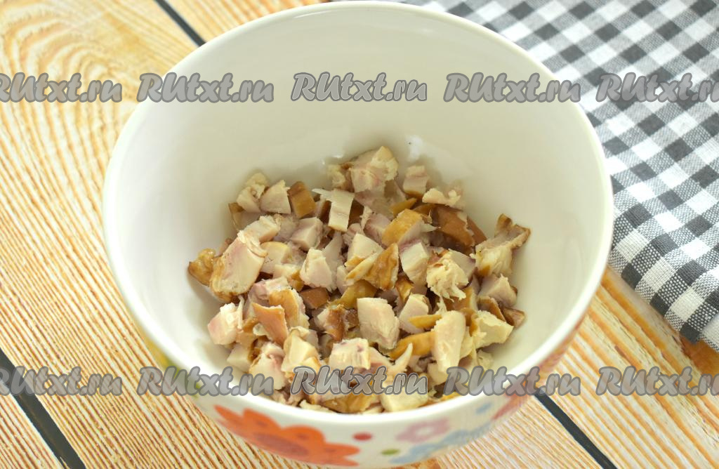 Копчёное мясо курицы отделяем от костей, если они есть. Крабовые палочки полностью размораживаем, снимаем с них плёнку. Яйца варим вкрутую (после закипания воды в течение 10 минут), затем даём им остыть и очищаем. Нарезаем 200 грамм копчёного куриного мяса на маленькие кубики, перекладываем в достаточно глубокую миску.