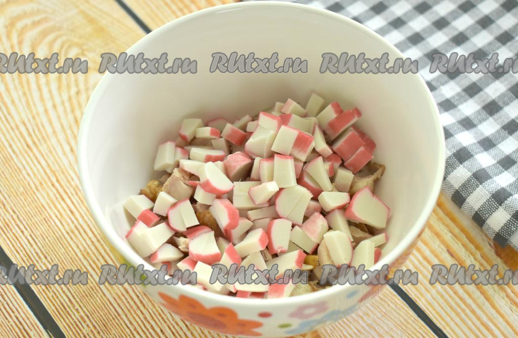 Нарезаем крабовые палочки на маленькие кубики и добавляем к копчёной курице.
