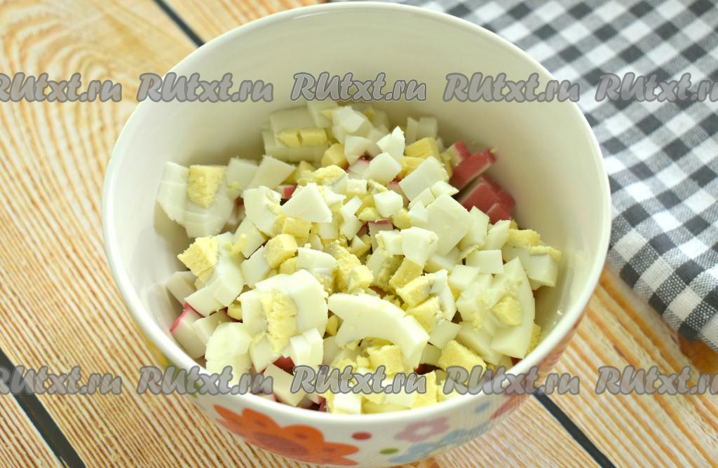 В эту же миску добавляем яйца, нарезанные на небольшие кусочки.