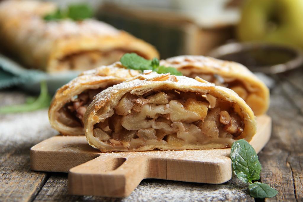 Выпекать штрудели с яблоками и орехами в разогретой духовке при температуре 200 градусов минут 35 (до румяности слоёного теста).