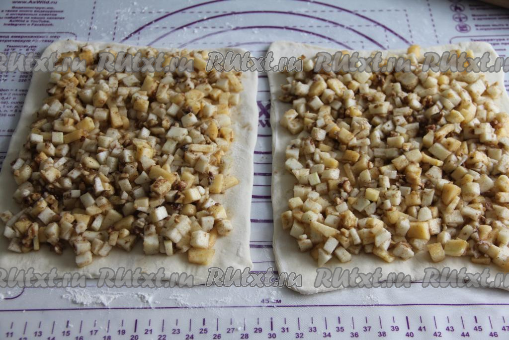 Начинку разделить на 2 части (мы будем готовить 2 штруделя) и выложить на раскатанные пласты слоёного теста, немного отступив от краёв. Разровнять яблочно-ореховую начинку, оставляя чистыми края теста.