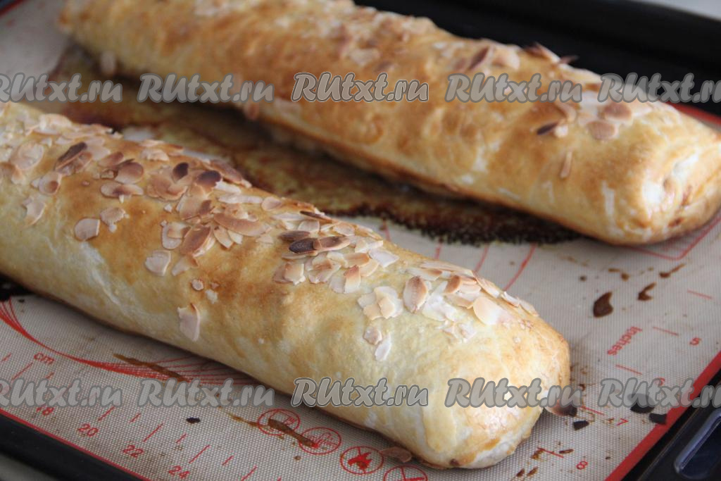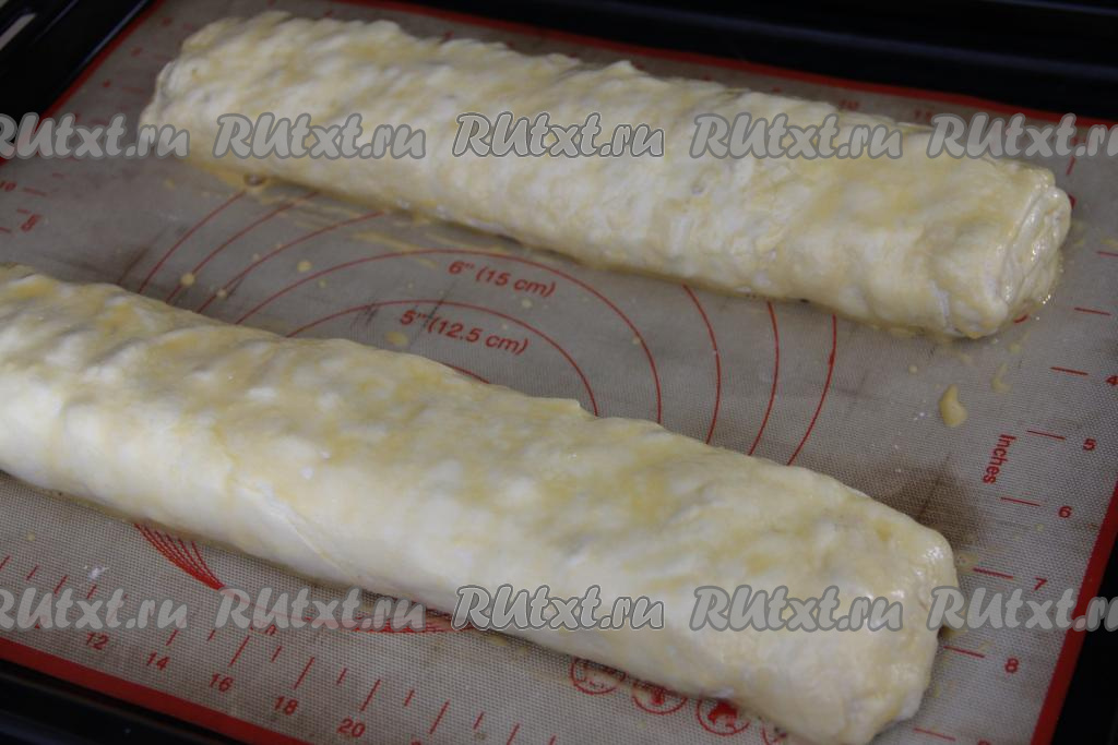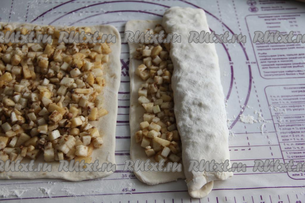 Скрепить края теста каждого штруделя. Выложить заготовки штруделей на расстоянии друг от друга на противень, застеленный ковриком (или пергаментом) для выпечки.
